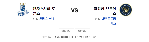 2025년 4월 1일, MLB 개막 시리즈! 캔자스시티 로열스와 밀워키 브루어스가 격돌합니다. 과연 누가 시즌 첫 승리를 거머쥘까요? 캔자스시티의 반등 vs 밀워키의 꾸준함! 선발 라인업, 관전 포인트, 중계 정보까지 몽땅 알려드립니다.